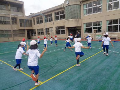 授業のはじめは、縄跳びの練習に取り組んでいます。