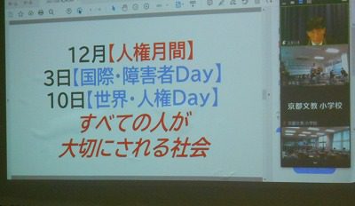 文教小学校では、11月から人権月間として“人権”についてあらゆる角度から考えてきました。明日に行われる月かげ人権集会でも、これまで学んだ“一人ひとりが大切”であることをよく思い出しながら、有意義な集会にしたいと話し合いました。