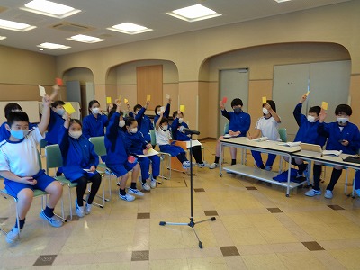 自分の立場を色カードで知らせています。色カードをもとに自分の意見を持ち、他学年と意見の交流をします。
