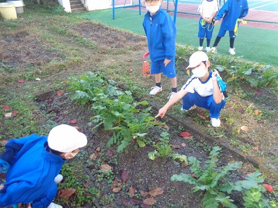 教室に帰る前に、学習園の大根の様子を見ました。葉が一層立派に成長していました。