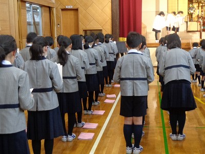 体育館に集合して、新学級代表が号令をかけてくれました。聖歌を歌っている間、ステージ上には、4年生の礼拝係の姿がありました。3年生も、一年後には礼拝係を担当します。阿弥陀さまと、礼拝係のきれいにそろった動きを見ながら聖歌を歌いました。