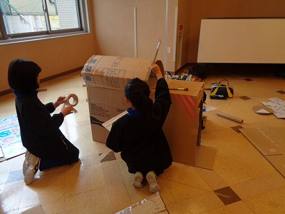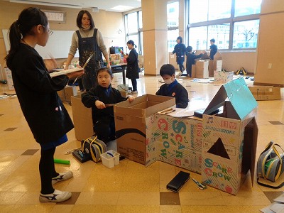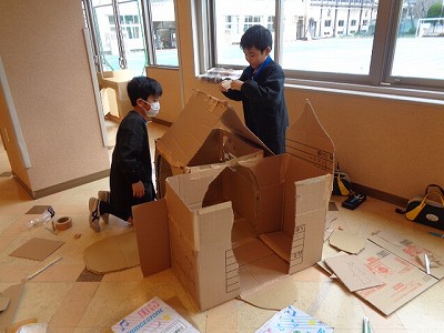 図工では、段ボールでの家づくりを進めています。