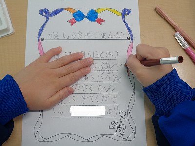 「日時」や「場所」など、招待状に書く内容を確かめた後、実際に招待状を書きました。