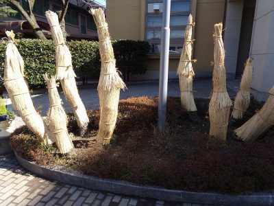 これは、蘇鉄(ソテツ)という植物です。コモという水辺に生えるイネ科の多年草を粗く編んでつくったむしろをかぶせています。