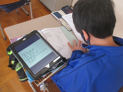 図画2作、立体作品2作のうちから、発表用の作品をタブレットに取り込んでいます。
