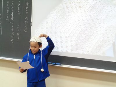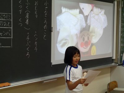 まずは、思い出の品物(幼い頃に使っていた物、着ていた物)をみんなに伝えるスピーチ学習を行っています。