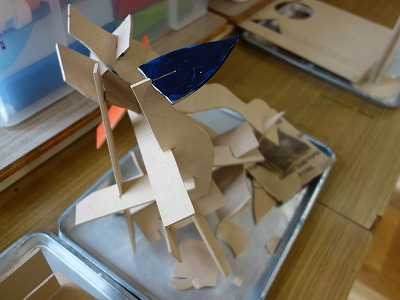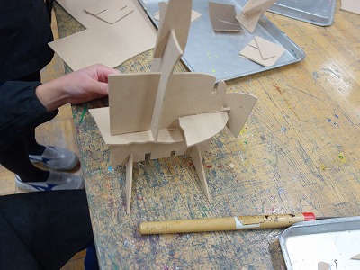 冬休みを挟んでの、続きとなる学習です。冬休みの間に、のこぎりの使い方を忘れていないかと少し心配していましたが、それは無用でした。児童はこれまでの経験を生かしながら、どんどん木を切り、やすりをかけて組んでいきました。
