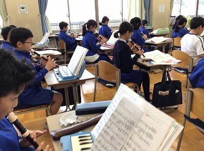 「♪ルパン三世のテーマ」の練習開始です。音楽室では階名(ドレミ…)で歌ったあとに、“エアリコーダー”練習を行いました。楽譜には「ソの♯」「シの♭」が登場します。
