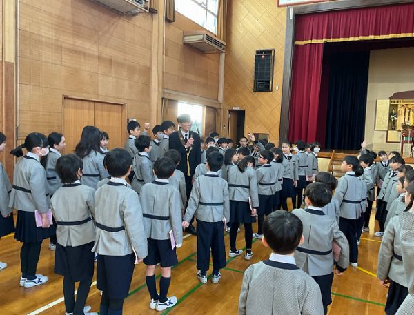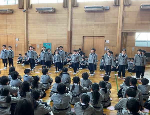 校長先生から、人に関するとんちクイズが出されました。お釈迦様と心に関する問題でした。お話を聞いて、子どもたちは、「利他の心」と「6年生ありがとうの会」を結びつけて、考えることができました。