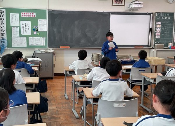 縦割りれんげ班長の6年生に向けて、各班によるプレゼント作りが始まろうとしています。給食時間に、5年生が各教室を周り、メッセージカードについて紹介してくれました。