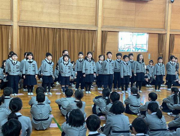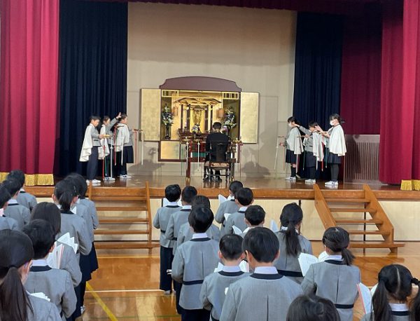 子どもたちは、仏教聖歌とお十念を、声高らかに歌い、お称えしました。礼拝後には、ありがとうの会で歌う全校合唱の練習もしました。