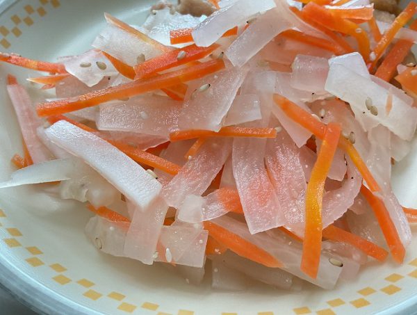 ☆ 「ごま和え」は、大根と人参を合わせました。ごまの香ばしい香りがしています。出汁が大根に染みこんでいました。