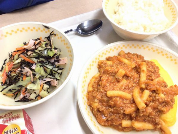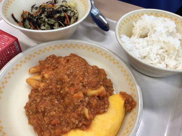 ミートソースは豚のひき肉だけでなく、大豆を細かく砕いたものも合わせています。