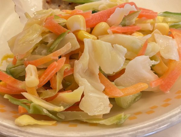 ☆ 「コールスローサラダ」は、細切りにした野菜をマヨネーズのドレッシングで和えました。ドレッシングは酢、砂糖、塩こしょうをよく混ぜて作りました。