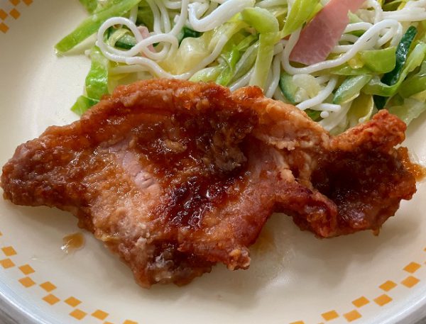 ☆ 「豚肉のアップルソ-ス」は、すったりんごを調味料に合わせてよく加熱し、ソースを作りました。豚肉は焼いたとき反り返らないように、筋切りして下処理をしておきました。