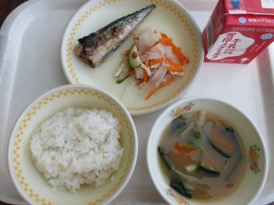 サンマは、魚焼きグリルでしっかり焼き目がつくように焼きました。調理員さんがサンマに塩をふりながら焼いて下さいました。