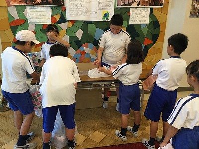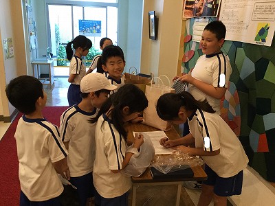 そして、大好きな図工の授業!今日は「藍染め」です。植物から絞った染色液は独特のにおいがします。「くさい~」という子もいれば、また、反対に「ぼく、このにおい好き!」と言う子も。鼻、手、目……五感全て使って、初体験の藍染めに楽しみながら取り組みました。