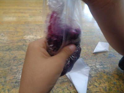 その後は、三角形に折った和紙の角に、きれいな色水をつけます。