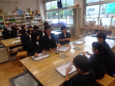 今日染めた紙は、乾かした後、2学期に栞を作ります。