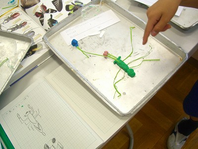 図鑑で「あたま・むね・はら」の形や、6本の足の長さなどをよく観察してから、作りました。