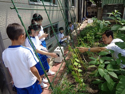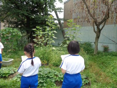 それぞれ、ツルレイシやお気に入りの一本の伸びを、しっかり確認できました。観察している本人、子ども達も、5,6月と比べて、ぐぐっと成長しています。