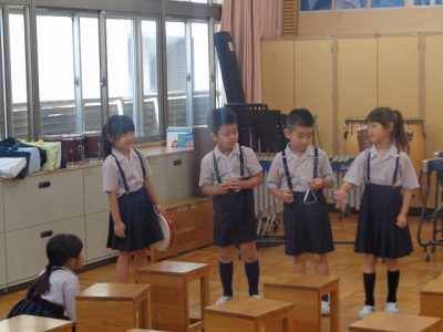 「トライアングル」「すず」「タンブリン」「カスタネット」をチーム内で回して楽しく発表しています。