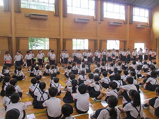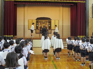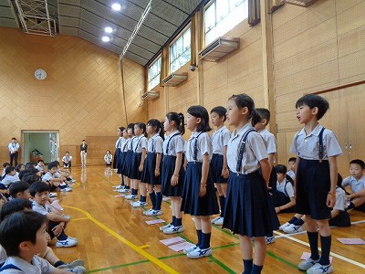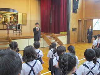 4年生の自然教室の話の後、校長先生も採取に出かけたことのある「水晶の原石」について、ご自身の体験とお話がありました。なかなか見つからない原石です。見つけても白っぽく、とても小さいですが、磨くとまばゆく美しい光を放つかのようです。それは私達も同じで、自分自身を磨く・・・つまり努力をすると「智慧ある人」となります。勉強、係活動、給食当番、掃除活動・・・自分に課せられた活動にまじめに取り組もう。そのことが、自分を磨くことであり、よりよい自分に成長することにつながります。