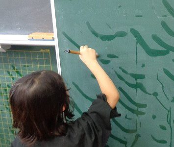 右払いがむずかしく、何度も練習プリントに書いたのですが、さらに練習がしたい人は、水で書く練習をしました。