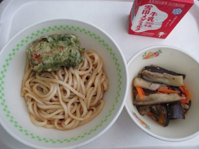 年に一度だけ行っている「冷やしうどん」の献立でした。うどんは細うどんを使用しています。なすは一度蒸してから、炒めて味つけをしました。つやっと張りのある紫色のきれいななすでした。