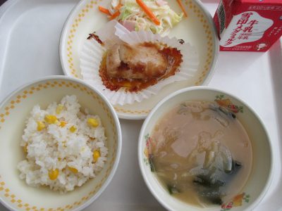 生のとうもろこしから粒をとって、ごはんと一緒に炊き上げたとうもろこしごはんです。粒のシャキシャキ感がよく感じられました。切り干し大根のたっぷり入った味噌汁は、野菜のうまみがたくさん出ていました。