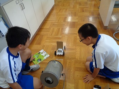 理科では、送風機の風を利用して、車を動かします。