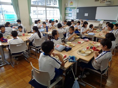 39の縦割れんげ班が、割り当てられた各教室で一緒に給食を頂きます。