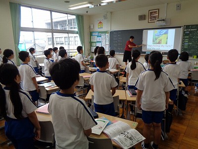 スクリーンの画像に合わせて、しっかり練習! 覚えるよりも、まずはハキハキと、元気よく発表できることが大切です。