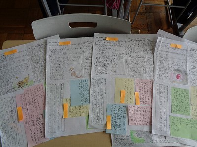 国語科学習では、先日書いた本の紹介文を互いに読み合い、ここでも、よいところを認め、こうした方がもっとよい、というアドバイスを書いた紙を感想シートに貼っていきました。