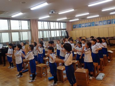 音楽室から、楽器の音がにぎやかに聞こえてきました。見てみると、「まほうのチャチャチャ」の曲に合わせて、チームごとに考えた音楽を発表中でした。
