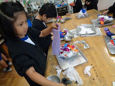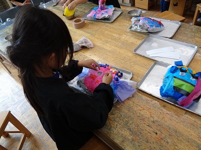 図工科授業では、それぞれの「トーテムポール」づくりが佳境に入っています。木ぎれやトイレットペーパーの芯、ペットボトルキャップなどなど、不要品を使って、楽しいトーテムポールが仕上がっていきます。「私のイメージは、遊園地。」「ぼくは、バンジージャンプができるように。」などなど、高くつみあげたり、横広がりにしたり。一人ひとりの個性が光ります。楽しみながら制作しているのが伝わってきて、こちらも笑顔になりました。