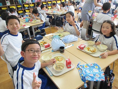 そして、今週は「れんげランチ」(縦割り班給食)実施です。はじめは、ちょっと緊張気味でしたが、少しずつ笑顔や笑い声も聞こえてきました。