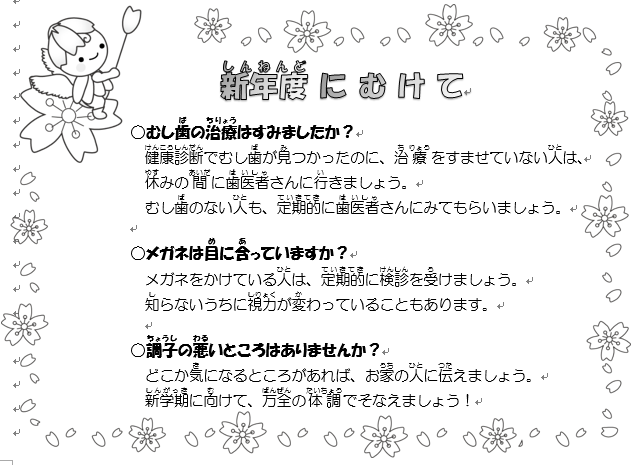 今日は修了式です。 保護者の皆さま、本年度も学校保健にご協力いただき、ありがとうございました。 新年度に向け、体のことで気になることがある人は、春休みの間に受診することをお勧めします。