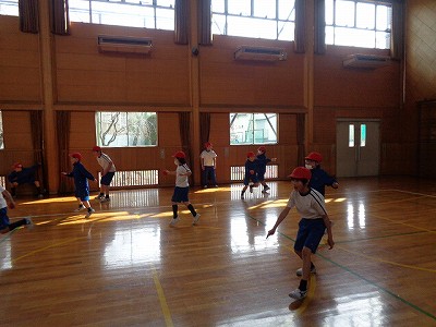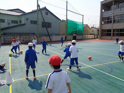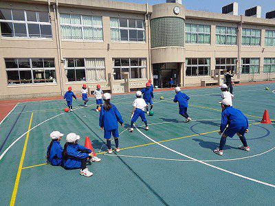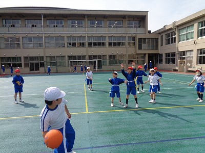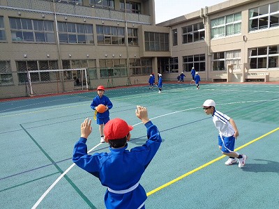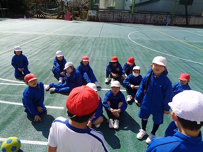 今日の体育は、1・2年生合同の「たまごわりサッカー」です。