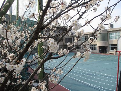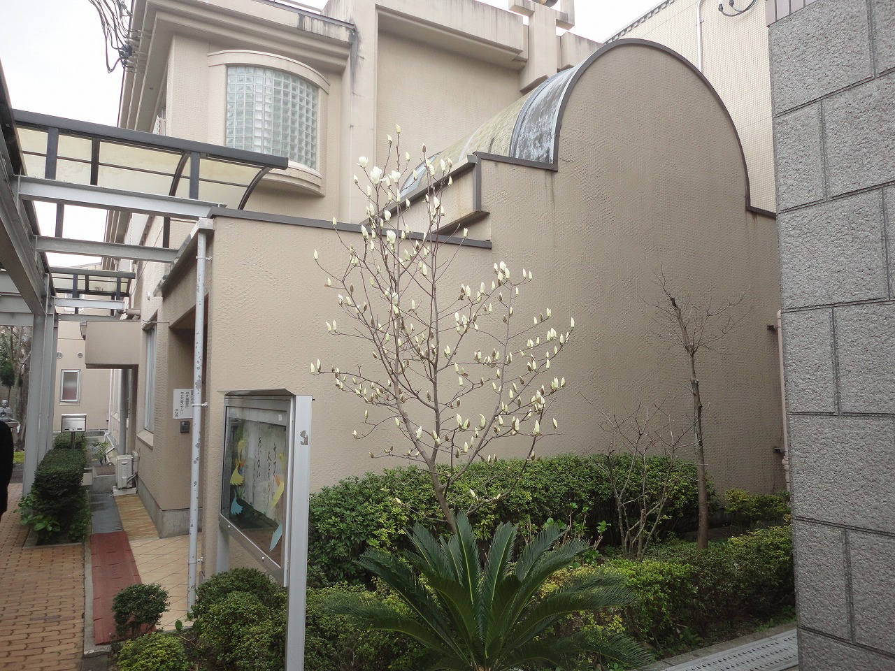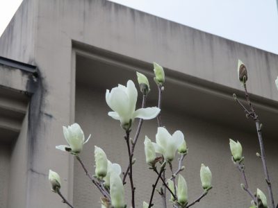 学校玄関前のモクレンが開き始めました。・・・春は、もうすぐです。