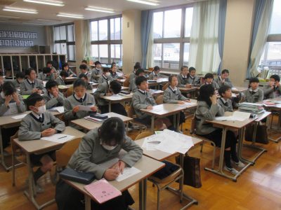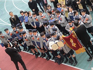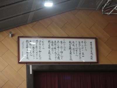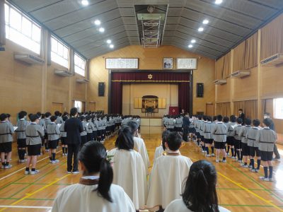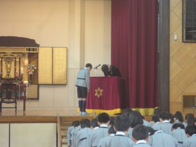 どんな自分になりたいのか、先を見据えることとのお話の後、「心の中に宿した校訓が、これからの新しい出会いの中で、拠り所・支えとなるでしょう。」という願いを込めたメッセージでした。