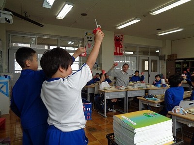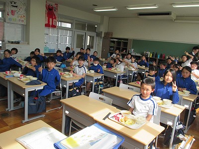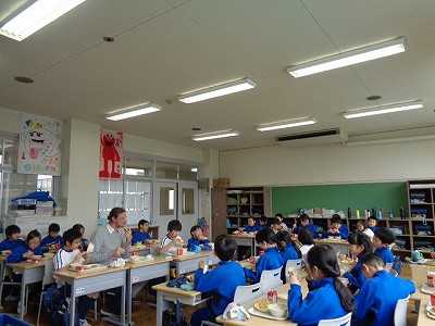 給食の時間は、ポール先生が3年生の教室に来てくれました!
