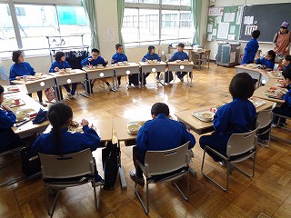 いつもはチーム毎に給食の時間を過ごしていますが、今日はお楽しみ会の係毎に給食をいただきました。