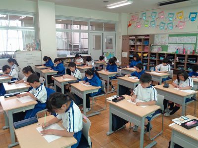 2年生には「用いる」や「計る」など、読み方が難しい問題も多いのですが、全体で確認しながら取り組んでいます。