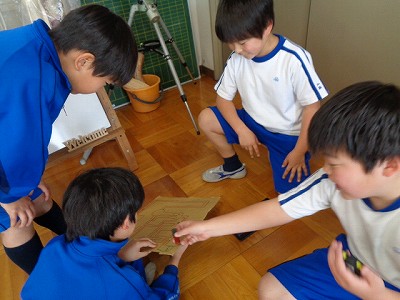カラー造形で力士をアレンジした後は、みんなのお楽しみ「文教小3月場所!」(トントン相撲)