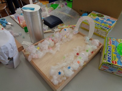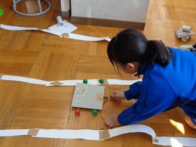 磁石カーレースや迷路など、自由な発想と工夫で、楽しいおもちゃができました。