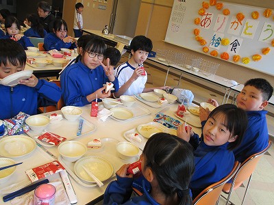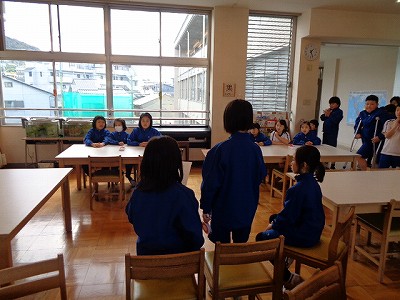 6年生に「ありがとう」の感謝の気持ちを伝える給食の時間でしたが、一週間それぞれの班が楽しく過ごしている姿が見られました。