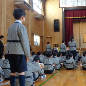 児童会本部からは、先月2週間にわたっての取り組み「私語0ゼロキャンペーン」の報告がありました。また、前本部メンバーの6年生から現本部の5年生へ「児童会旗」の受け渡しがありました。