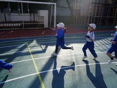 今朝の「根っこマラソン」は、小学校の運動場を走りました。