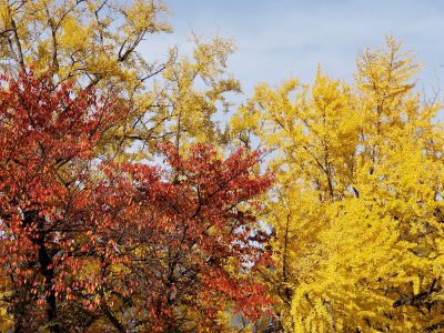 京都御苑の有名な木“サクラマツ”の横を歩きました。倒れた松の木の幹を通って、桜が自生し、このように立派な桜の木として育っているものです。赤や黄色の色づきが美しいです。
